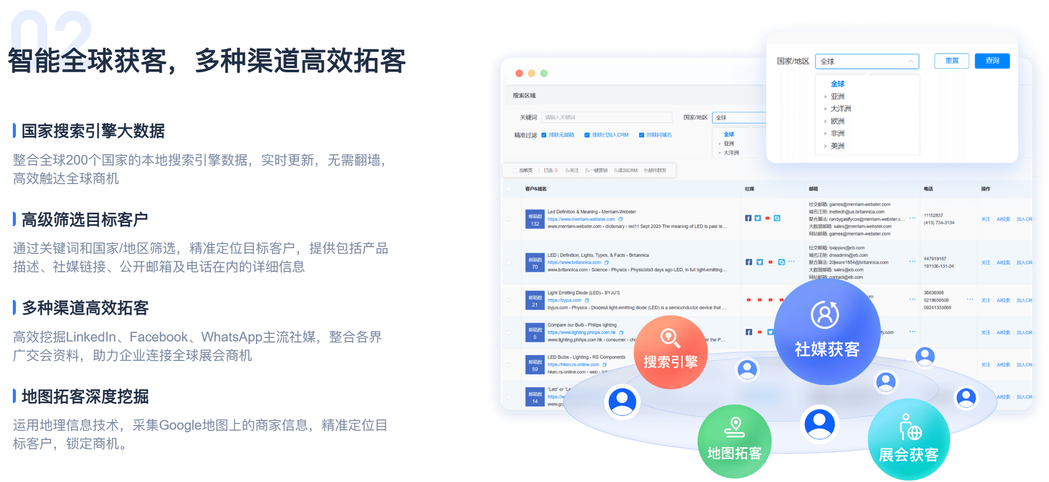 在信息碎片化的时代,单一渠道已无法满足获客需求。小蓝本外贸版创新性地将全球海关数据、主流社媒(如LinkedIn、Facebook)公开信息、全球数千场行业展会名录进行深度融合。这套“智能雷达”系统,能自动扫描、抓取、清洗并整合多源线索,为企业提供包含职位、邮箱、电话在内的高质量客户画像。所有线索可一键同步至内置CRM,实现从发现到跟进的无缝流转,极大地提升了销售团队的作战效率。