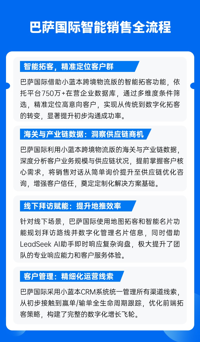 面对广阔的蓝海与传统拓客的“暗礁”,南京巴萨国际货运代理有限公司的破局之道,在于构建了一套以数据智能为核心、以客户场景为牵引的精准营销与客户运营体系。这套体系将小蓝本跨境物流版的四大核心能力,深度融入巴萨国际从市场洞察、客户触达、专业赋能到精细运营的全业务流程之中,形成了一套完整的智慧解决方案。