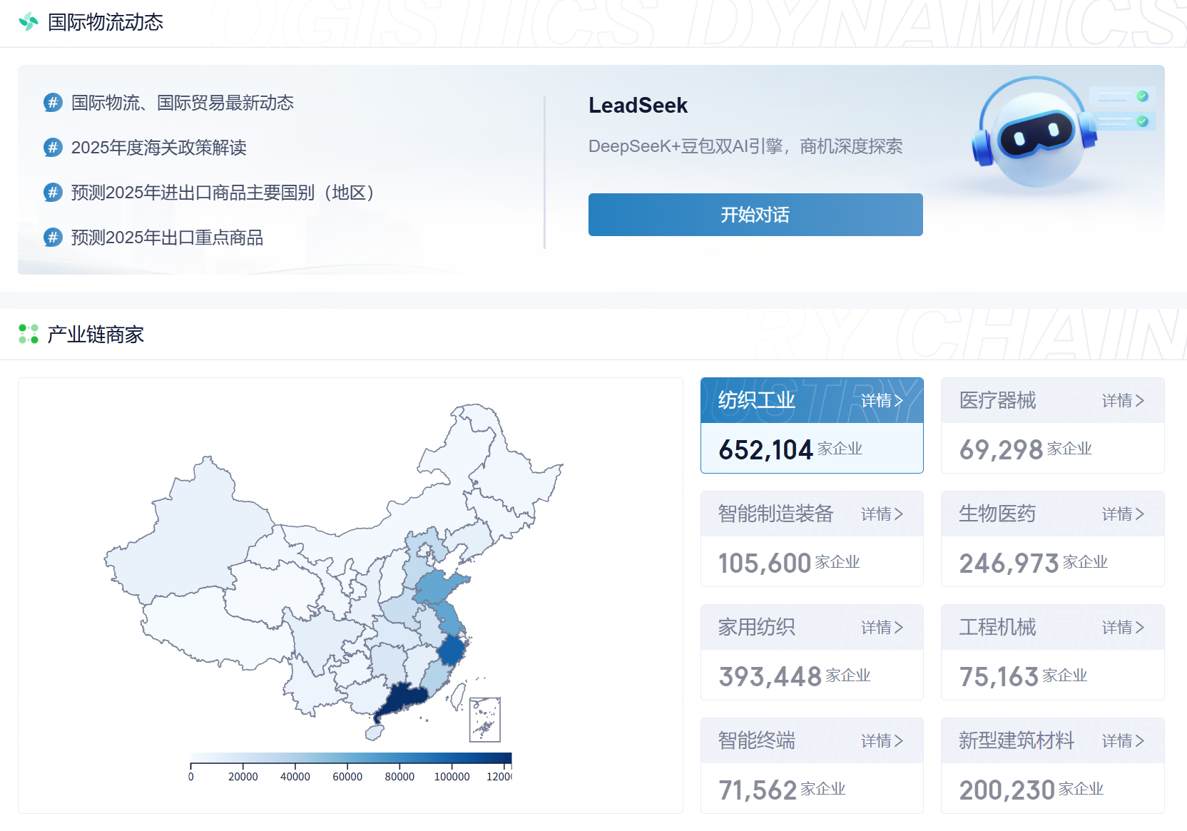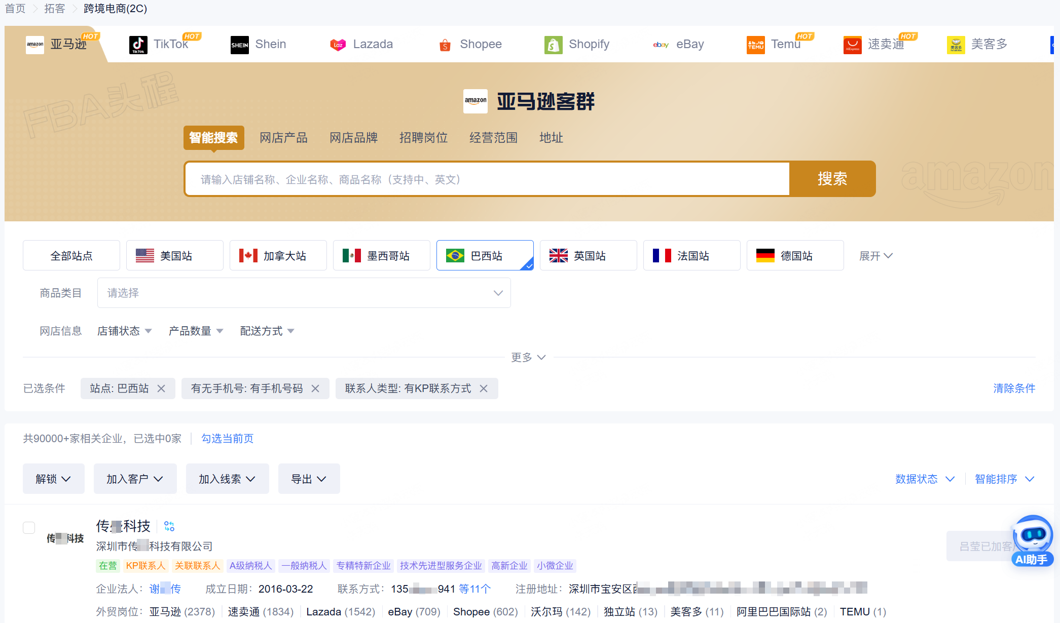 无论是筛选“主营家具产品、通过阿里巴巴国际站出口至东南亚的制造工厂”,还是“在亚马逊美国站销售3C产品、物流需求旺盛的跨境电商卖家”,系统都能在瞬间从海量数据中精准锁定目标企业列表。