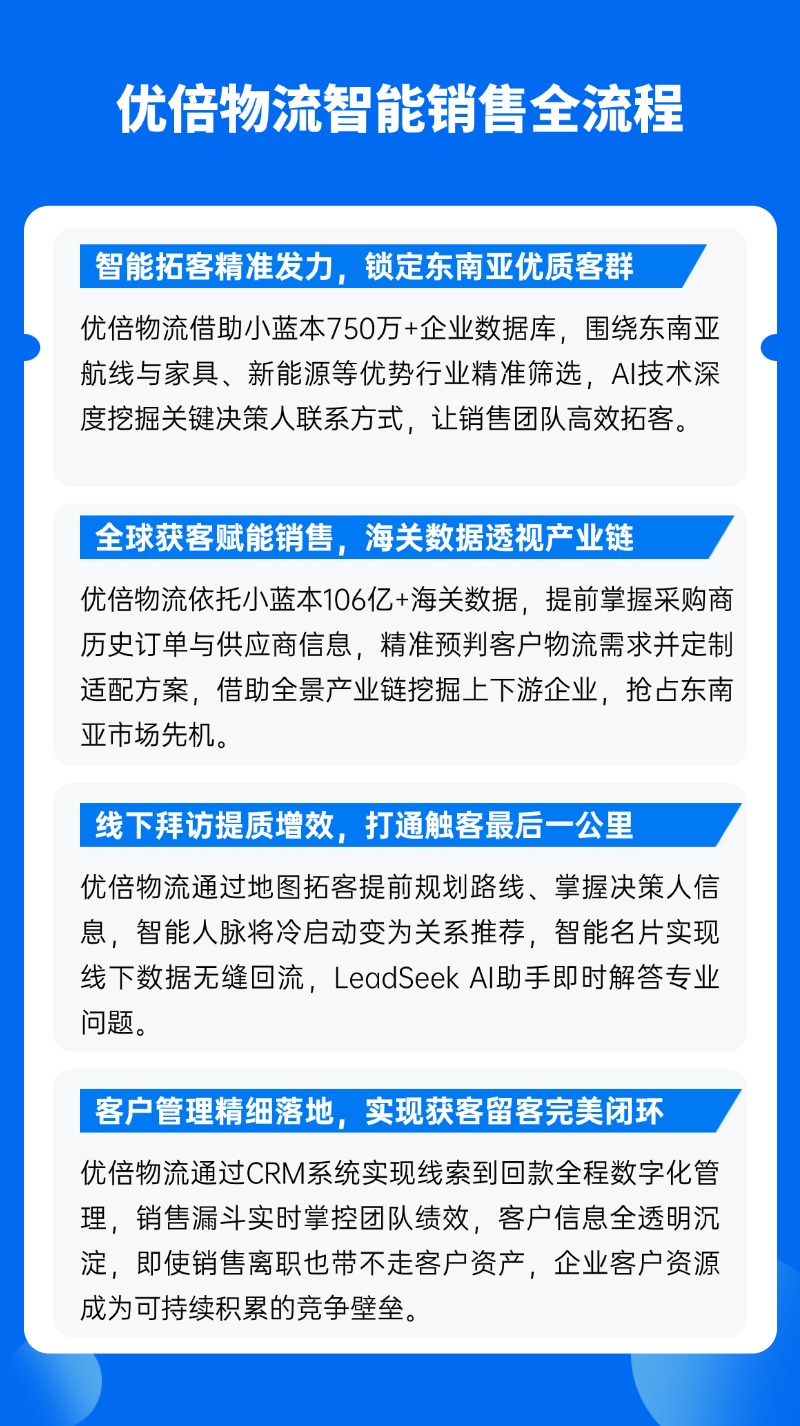 面对传统获客模式的重重壁垒,广州优倍国际物流有限公司以小蓝本为破局利器,通过小蓝本跨境物流版的四大核心能力,实现了销售数字化的转型。以下解决方案围绕其东南亚市场拓展需求,结合“一带一路”客户特性,构建了一套可复制的智能获客体系: