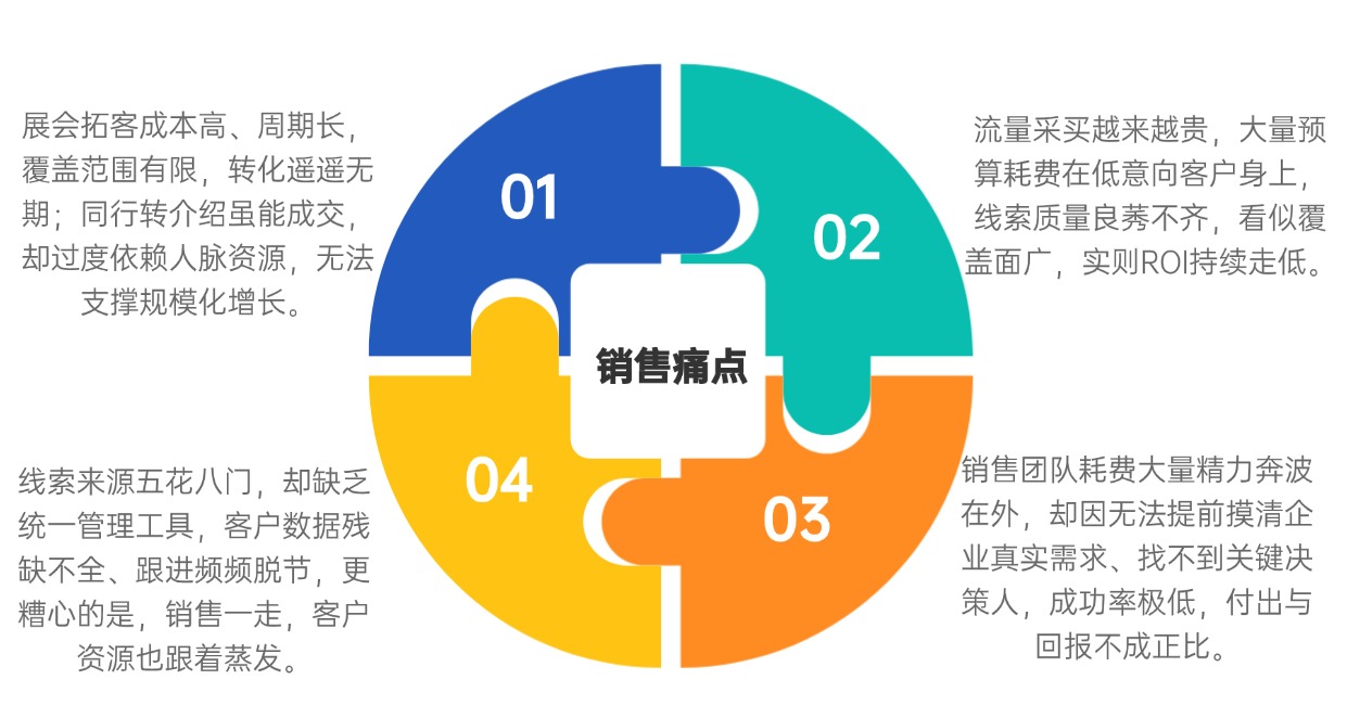 最后,客户信息分散沉淀难——线索来源多元(如展会、线上平台、转介绍),但缺乏统一整合工具,导致客户数据残缺、跟进脱节,甚至因销售离职造成客户资源流失。这些问题共同导致企业陷入“高成本、低转化”的恶性循环,难以在快速变化的市场中抢占先机。