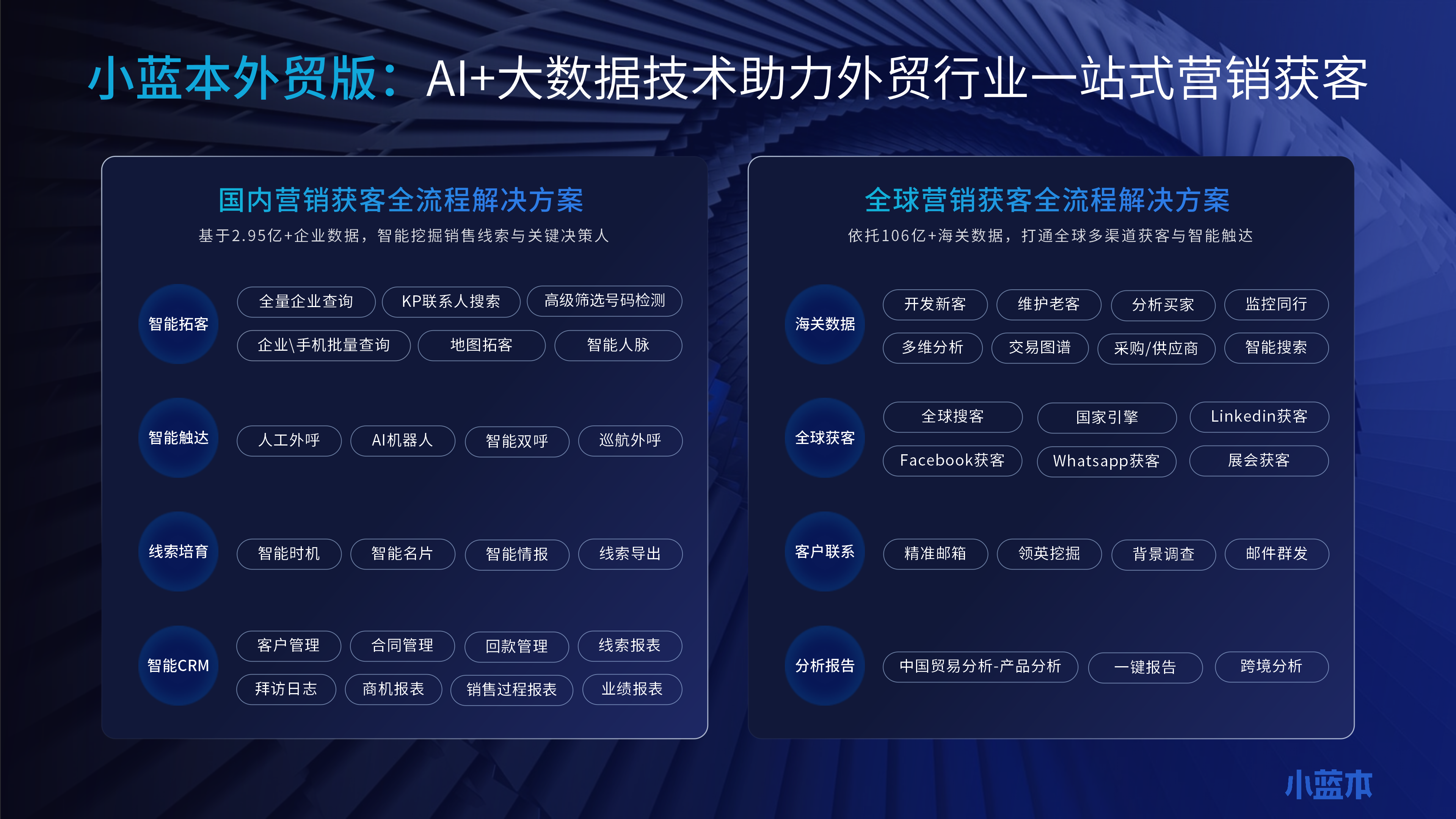 小蓝本隶属于港股上市公司VALA集团,是一款主动客户开发、大数据获客、决策人挖掘的AI数据拓客系统,致力于为企业提供端到端的智能营销获客解决方案,是中国领先的智能营销获客系统服务商。平台深度融合大数据与AI技术,搭建了从智能拓客、商机触达、培训转化到系统化客户管理的一站式服务体系。目前平台已聚合超过3亿家企业数据、106亿条海关交易记录、上亿关键决策人公开联系方式、10000+数据维度筛选,拥有830万注册用户,服务覆盖外贸、制造业、跨境物流等众多领域。