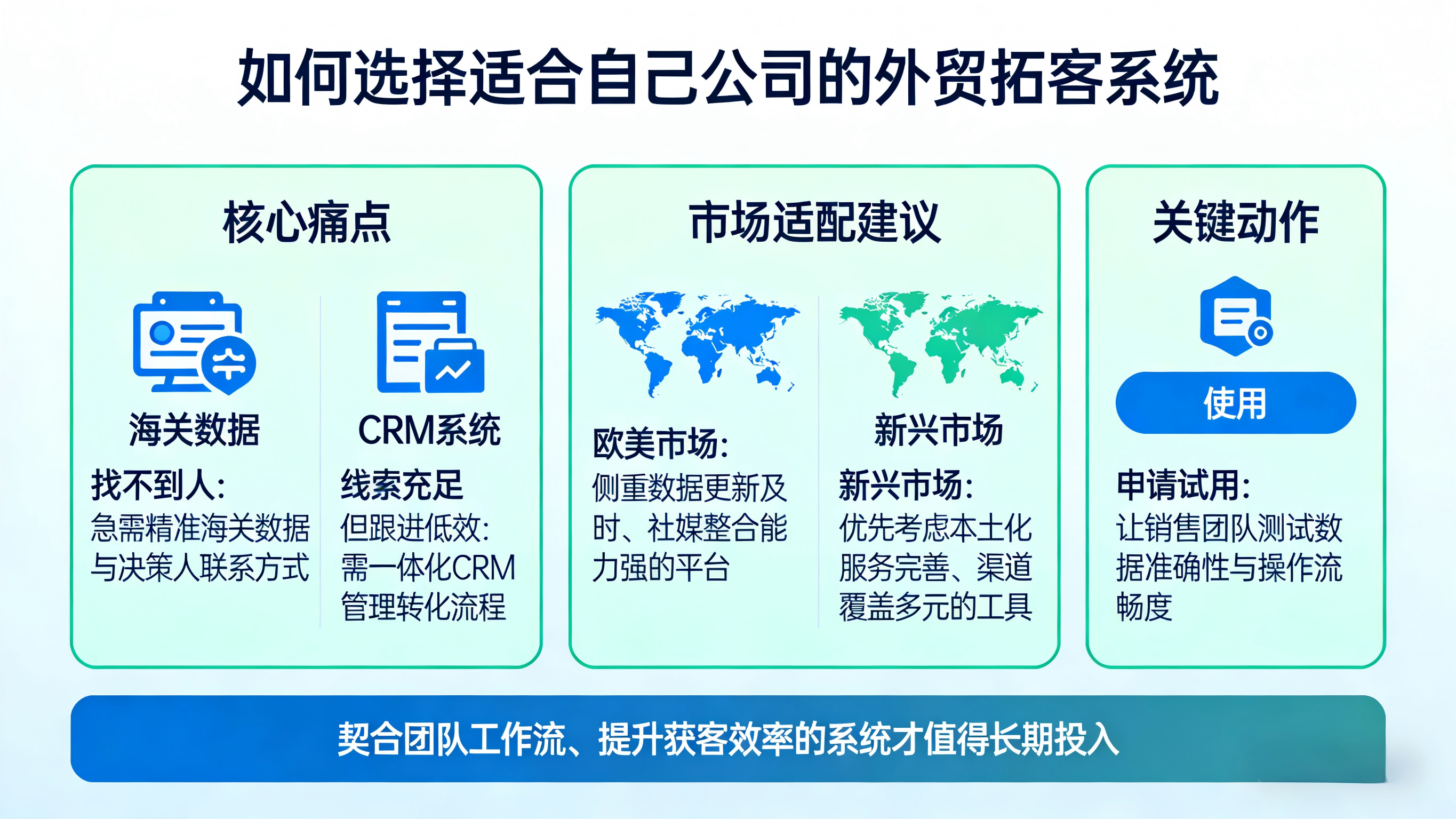 选择适合公司的外贸拓客系统,关键在于回归业务本质,而非盲目追求功能堆砌。建议先厘清自身核心痛点:是困在“找不到人”的阶段,急需精准的海关数据与决策人联系方式;还是线索充足但跟进效率低下,需要一体化CRM来管理转化流程。对于聚焦欧美市场的企业,可侧重数据更新及时、社媒整合能力强的平台;而主攻新兴市场的团队,则应优先考虑本土化服务完善、渠道覆盖多元的工具。最重要的是,务必申请试用,让销售团队在真实场景中测试数据的准确性与操作的流畅度——只有真正契合团队工作流、能直接提升获客效率的系统,才值得长期投入。