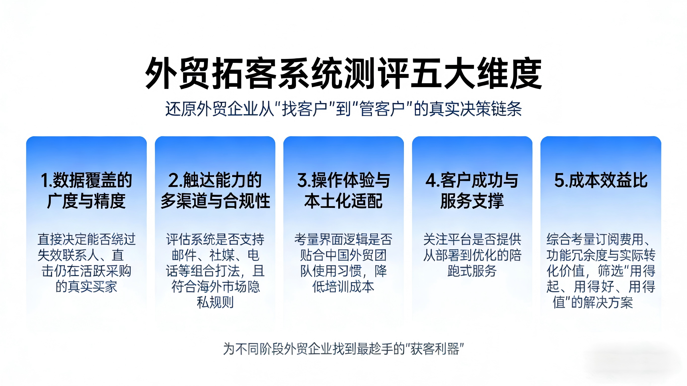 本次测评的维度设计,旨在还原外贸企业从“找客户”到“管客户”的真实决策链条,而非简单堆砌功能参数。我们重点关注五大核心维度:数据覆盖的广度与精度,这直接决定了能否绕过失效联系人、直击仍在活跃采购的真实买家;触达能力的多渠道与合规性,评估系统是否支持邮件、社媒、电话等组合打法,且符合海外市场的隐私规则;操作体验与本土化适配,考量界面逻辑是否贴合中国外贸团队的使用习惯,能否降低培训成本;客户成功与服务支撑,关注平台是否提供从部署到优化的陪跑式服务,而非一卖了之;最后是成本效益比,综合考量订阅费用、功能冗余度与实际转化价值,筛选出真正能让中小外贸企业“用得起、用得好、用得值”的解决方案。基于这五重维度,我们力求在纷繁的市场中,为不同阶段的外贸企业找到那把最趁手的“获客利器”。