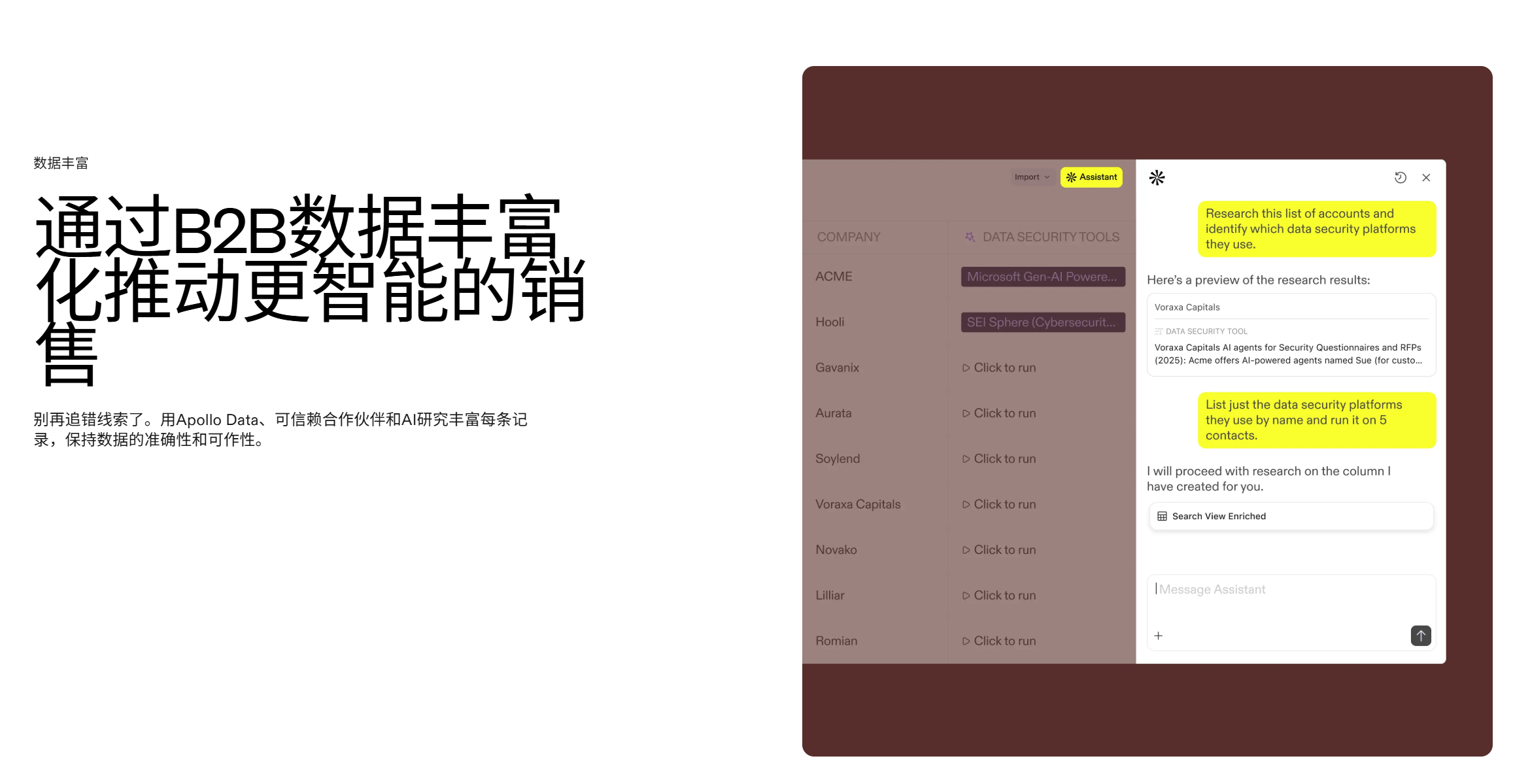 Apollo是覆盖全球的B2B拓客平台,拥有超2.7亿条企业联系人数据,深度整合销售全流程工具,为外贸企业提供从线索挖掘到转化成交的一站式解决方案。