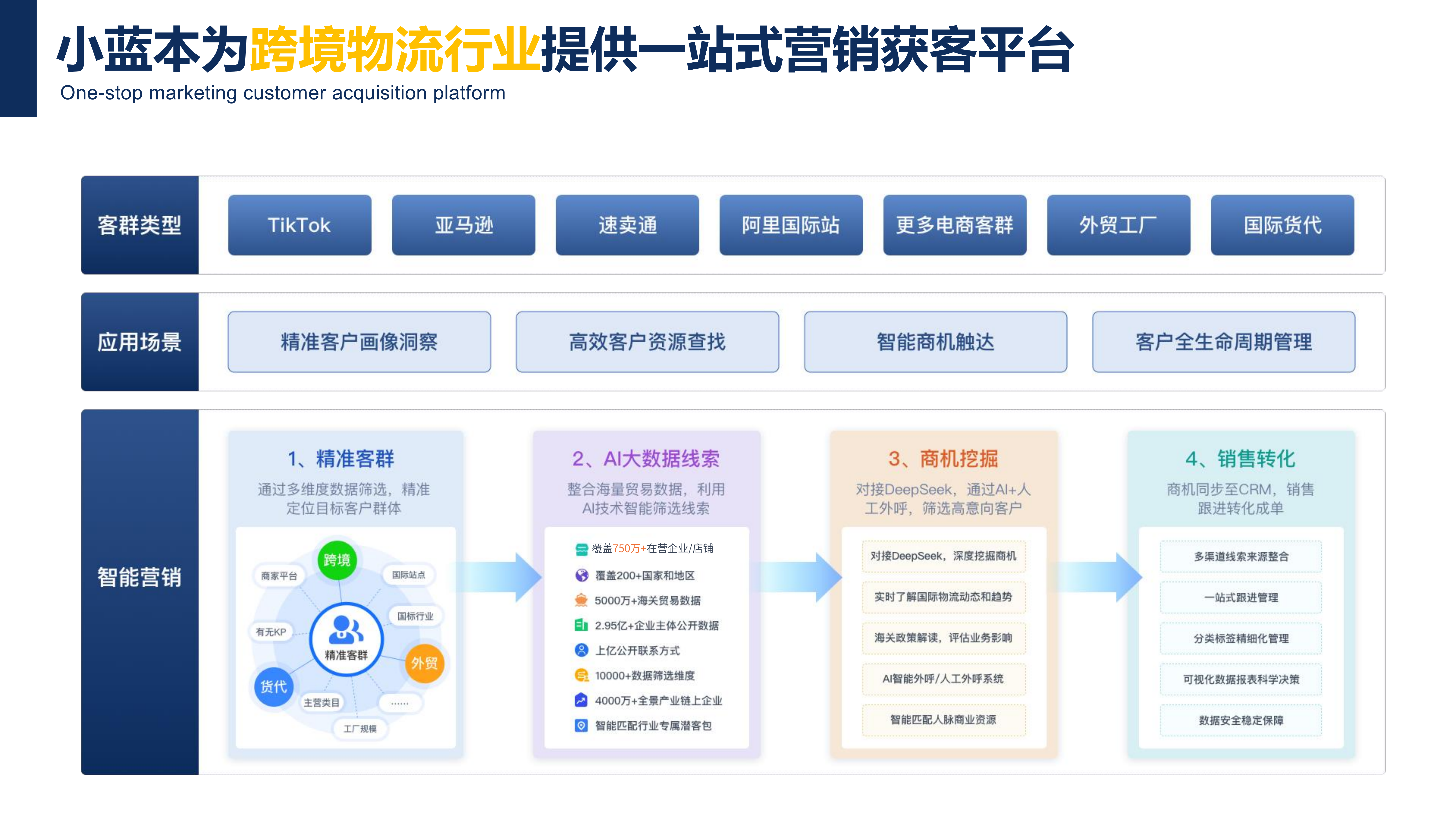品牌定位:专为国际物流行业打造的全流程智能销售解决方案平台,依托AI与大数据实现从潜客挖掘到转化管理的闭环。